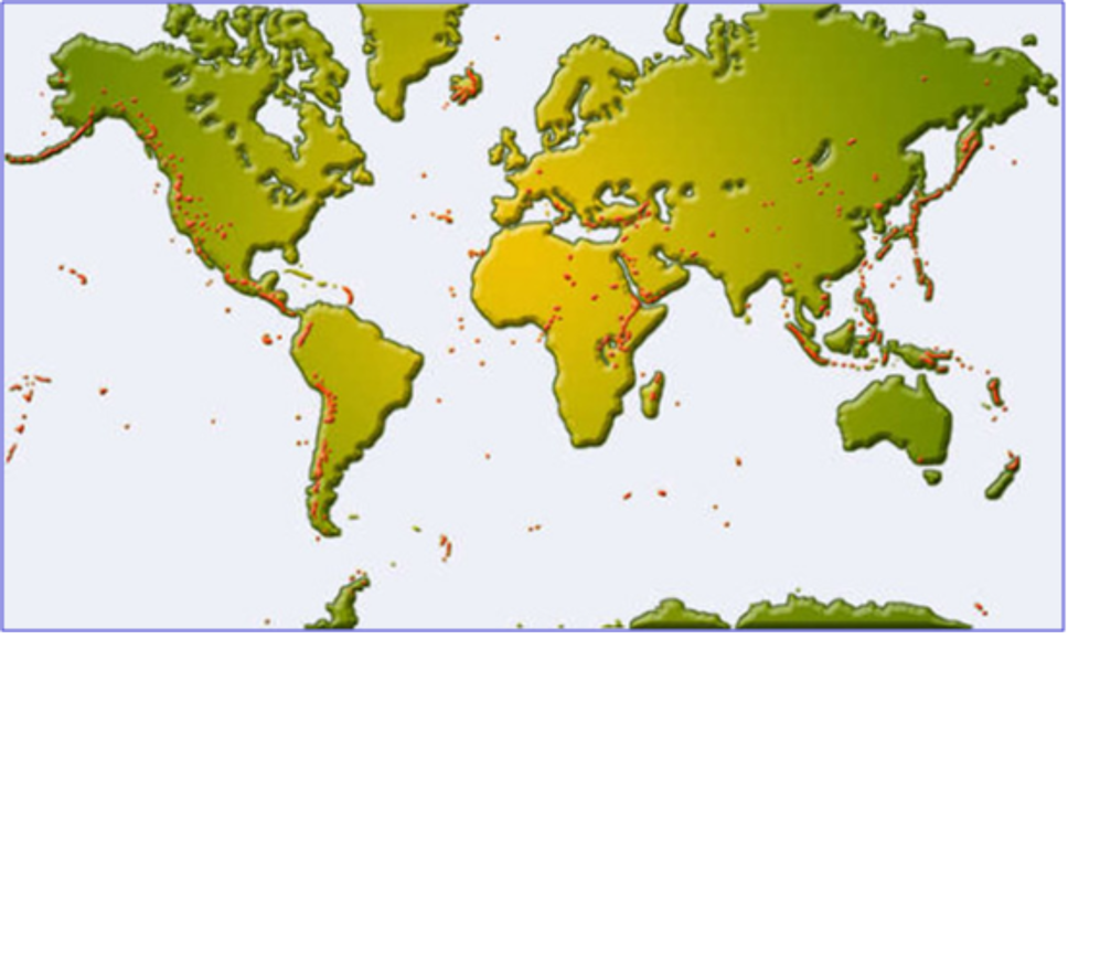 Los volcanes son los puntos rojos
