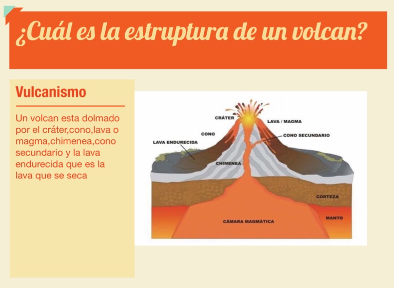 Un volcan esta dolmado por el cráter,cono,lava o magma,chimenea,cono secundario y la lava endurecida que es la lava que se seca