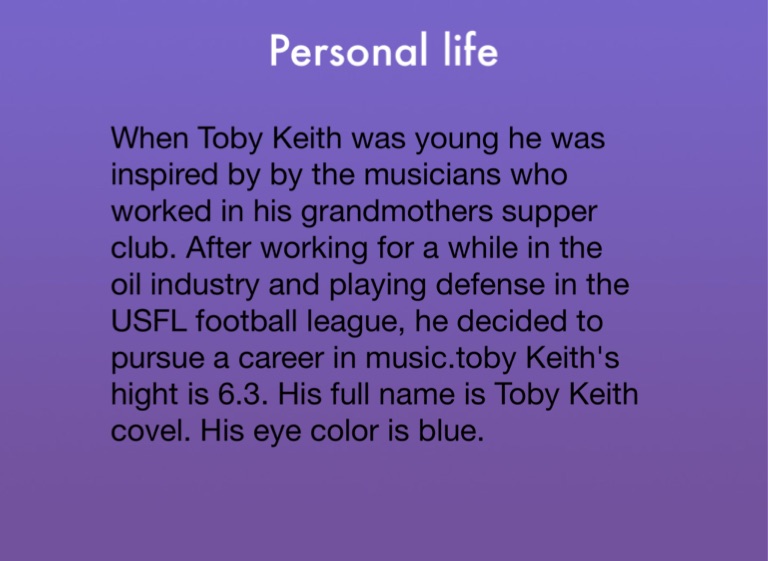 When Toby Keith was young he was inspired by by the musicians who worked in his grandmothers supper club. After working for a while in the oil industry and playing defense in the USFL football league, he decided to pursue a career in music.toby Keith's hight is 6.3. His full name is Toby Keith covel. His eye color is blue.