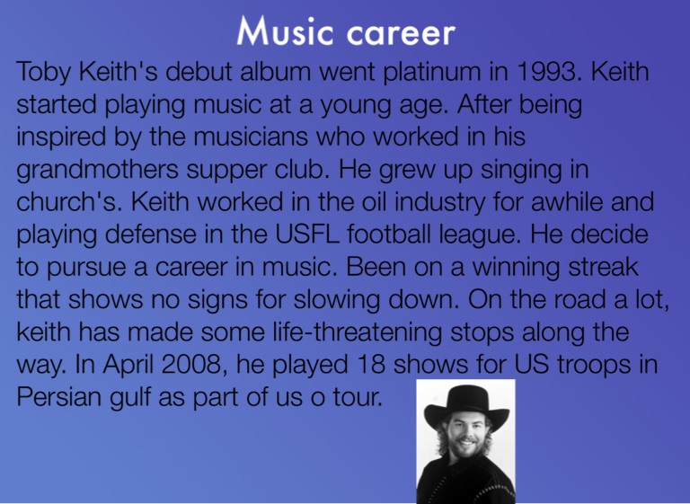 Toby Keith's debut album went platinum in 1993. Keith started playing music at a young age. After being inspired by the musicians who worked in his grandmothers supper club. He grew up singing in church's. Keith worked in the oil industry for awhile and playing defense in the USFL football league. He decide to pursue a career in music. Been on a winning streak that shows no signs for slowing down. On the road a lot, keith has made some life-threatening stops along the way. In April 2008, he played 18 shows for US troops in Persian gulf as part of us o tour.