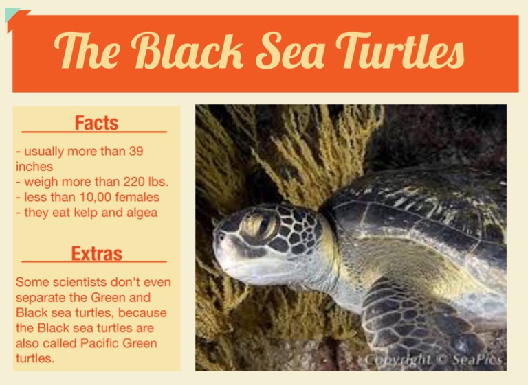 Some scientists don't even separate the Green and Black sea turtles, because the Black sea turtles are also called Pacific Green turtles.