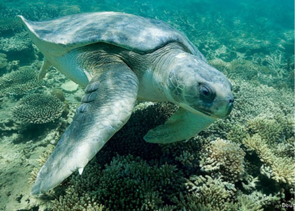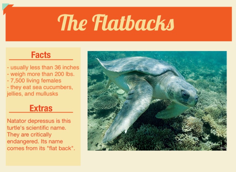 Natator depressus is this turtle's scientific name. They are critically endangered. Its name comes from its "flat back".