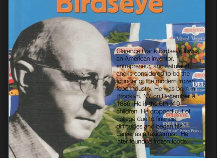 Clarence Frank Birdseye II was an American inventor, entrepreneur, and naturalist, and is considered to be the founder of the modern frozen food industry. He was born in Brooklyn, NY on December 9, 1886. He is the 6th of 9 children. He dropped out of college due to financial difficulties and began his career as a taxidermist. He later founded frozen foods.