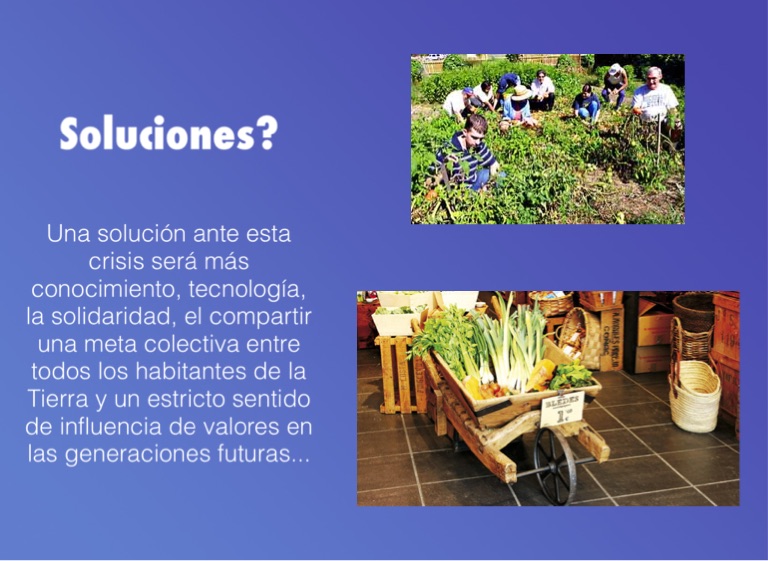 Una solución ante esta crisis será más conocimiento, tecnología, la solidaridad, el compartir una meta colectiva entre todos los habitantes de la Tierra y un estricto sentido de influencia de valores en las generaciones futuras...