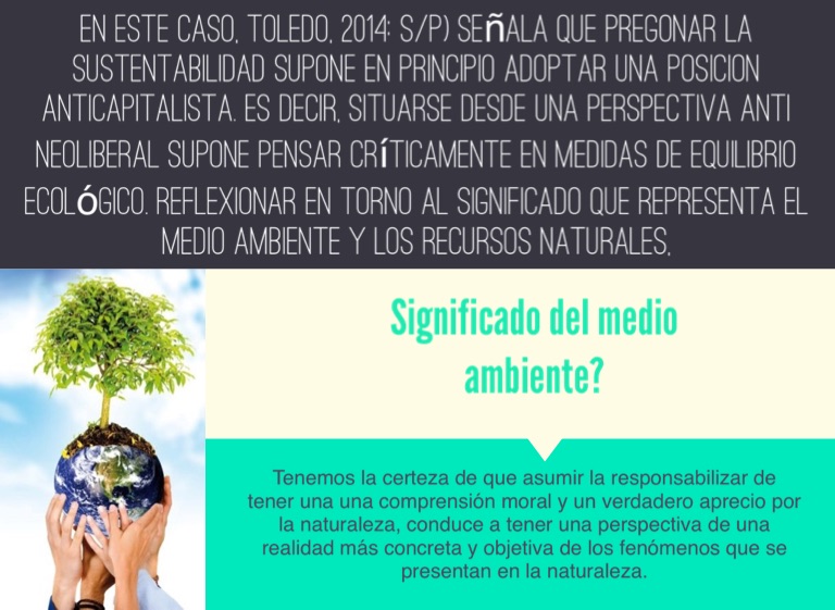 En este caso, Toledo, 2014: s/p) señala que pregonar la sustentabilidad supone en principio adoptar una posicion anticapitalista. Es decir, situarse desde una perspectiva anti neoliberal supone pensar críticamente en medidas de equilibrio ecológico. Reflexionar en torno al significado que representa el medio ambiente y los recursos naturales,