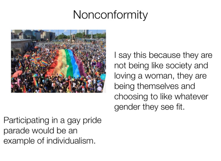 Participating in a gay pride parade would be an example of individualism.