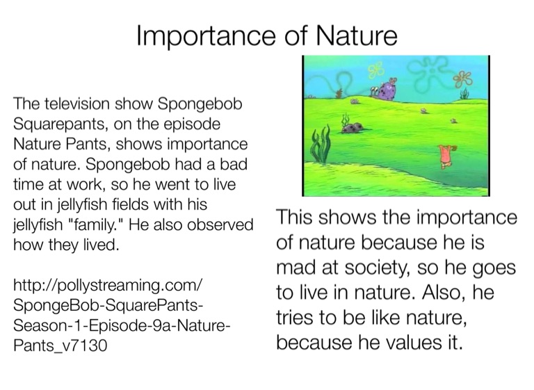 The television show Spongebob Squarepants, on the episode Nature Pants, shows importance of nature. Spongebob had a bad time at work, so he went to live out in jellyfish fields with his jellyfish "family." He also observed how they lived.