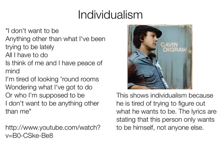 This shows individualism because he is tired of trying to figure out what he wants to be. The lyrics are stating that this person only wants to be himself, not anyone else.