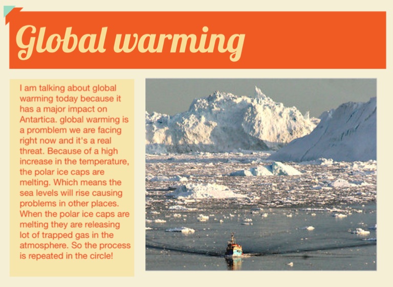 I am talking about global warming today because it has a major impact on Antartica. global warming is a promblem we are facing right now and it's a real threat. Because of a high increase in the temperature, the polar ice caps are melting. Which means the sea levels will rise causing problems in other places. When the polar ice caps are melting they are releasing lot of trapped gas in the atmosphere. So the process is repeated in the circle!