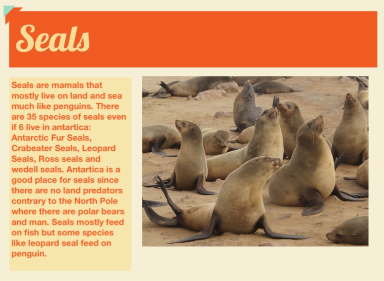Seals are mamals that mostly live on land and sea much like penguins. There are 35 species of seals even if 6 live in antartica: Antarctic Fur Seals, Crabeater Seals, Leopard Seals, Ross seals and wedell seals. Antartica is a good place for seals since there are no land predators contrary to the North Pole where there are polar bears and man. Seals mostly feed on fish but some species like leopard seal feed on penguin.
