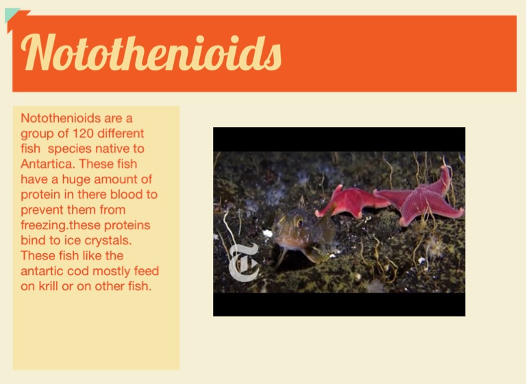 Notothenioids are a group of 120 different fishspecies native to Antartica. These fish have a huge amount of protein in there blood to prevent them from freezing.these proteins bind to ice crystals. These fish like the antartic cod mostly feed on krill or on other fish.