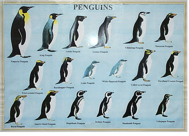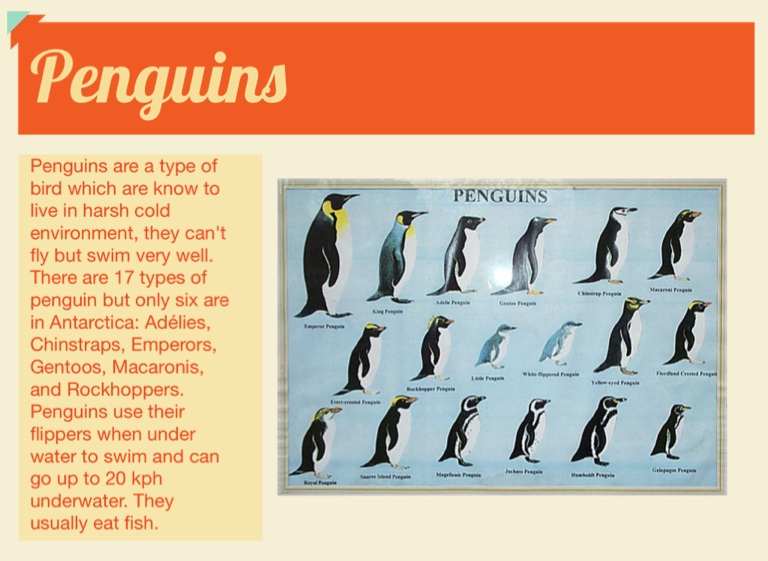 Penguins are a type of bird which are know to live in harsh cold environment, they can't fly but swim very well. There are 17 types of penguin but only six are in Antarctica: Adélies, Chinstraps, Emperors, Gentoos, Macaronis, and Rockhoppers. Penguins use their flippers when under water to swim and can go up to 20 kph underwater. They usually eat fish.