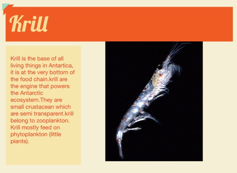 Krill is the base of all living things in Antartica, it is at the very bottom of the food chain.krill are the engine that powers the Antarctic ecosystem.They are small crustacean which are semi transparent.krill belong to zooplankton. Krill mostly feed on phytoplankton (little plants).