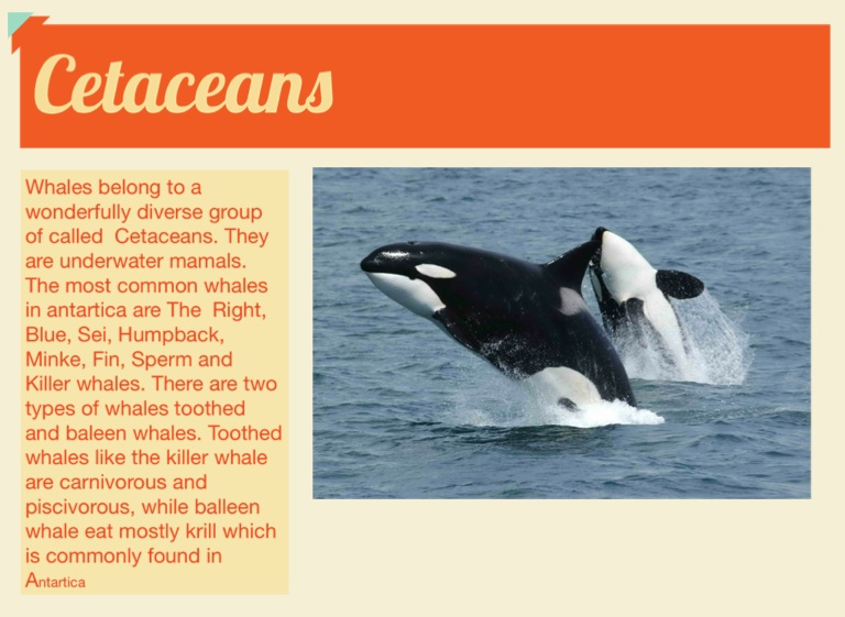 Whales belong to a wonderfully diverse group of called Cetaceans. They are underwater mamals. The most common whales in antartica are The Right, Blue, Sei, Humpback, Minke, Fin, Sperm and Killer whales. There are two types of whales toothed and baleen whales. Toothed whales like the killer whale are carnivorous and piscivorous, while balleen whale eat mostly krill which is commonly found in Antartica