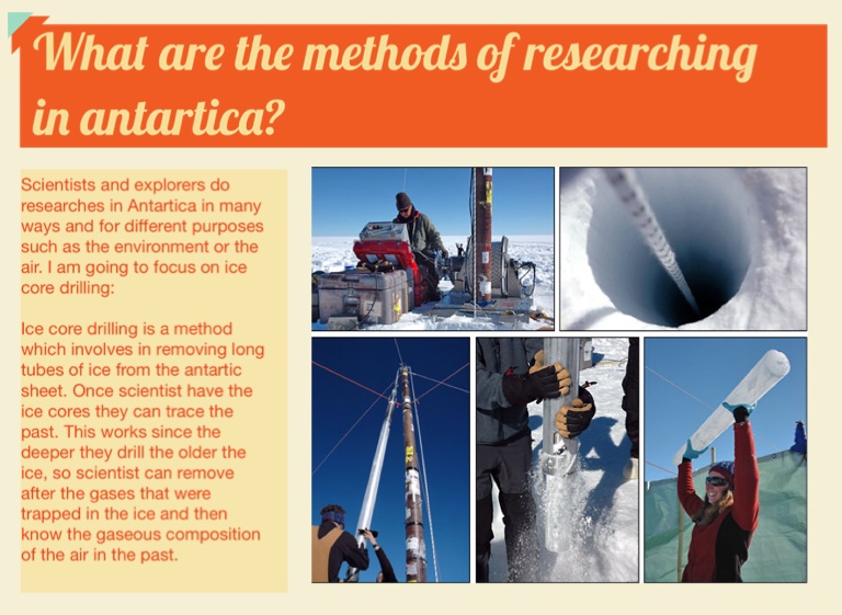 Scientists and explorers do researches in Antartica in many ways and for different purposes such as the environment or the air. I am going to focus on ice core drilling: