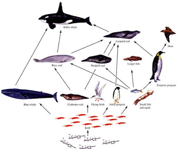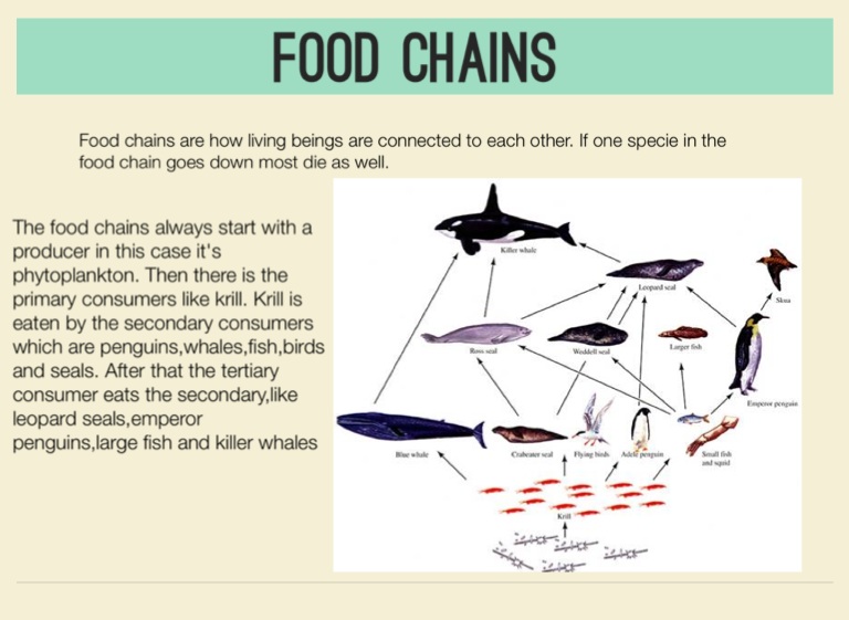 The food chains always start with a producer in this case it's phytoplankton. Then there is the primary consumers like krill. Krill is eaten by the secondary consumers which are penguins,whales,fish,birds and seals. After that the tertiary consumer eats the secondary,like leopard seals,emperor penguins,large fish and killer whales
