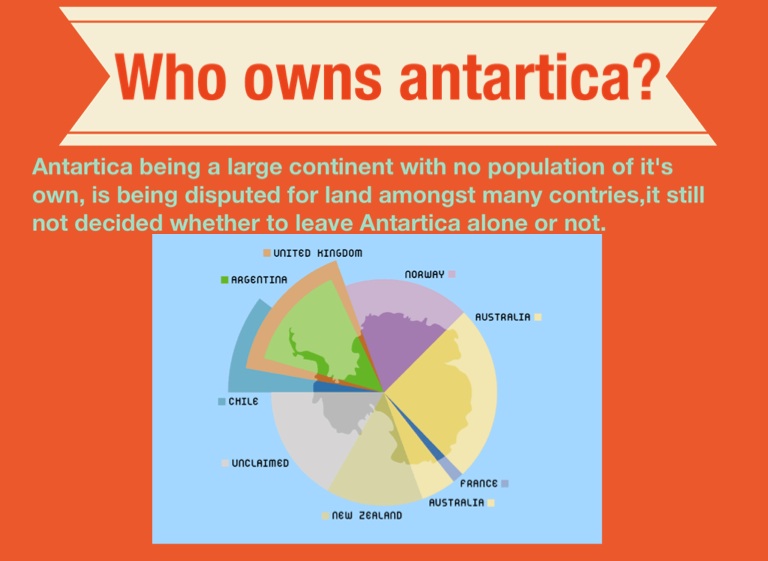 Antartica being a large continent with no population of it's own, is being disputed for land amongst many contries,it still not decided whether to leave Antartica alone or not.