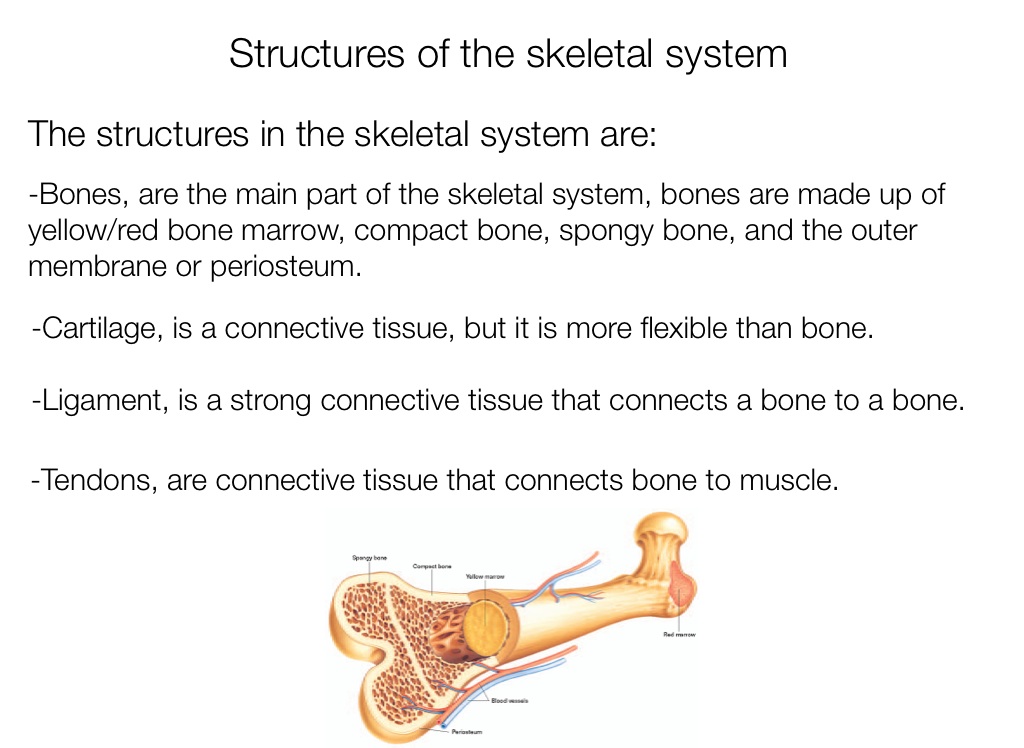 -Bones, are the main part of the skeletal system, bones are made up of yellow/red bone marrow, compact bone, spongy bone, and the outer membrane or periosteum.