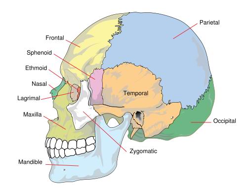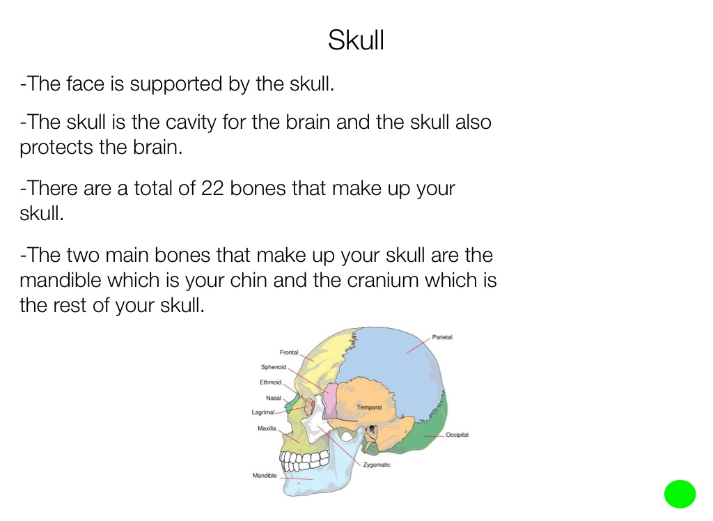 -The two main bones that make up your skull are the mandible which is your chin and the cranium which is the rest of your skull.