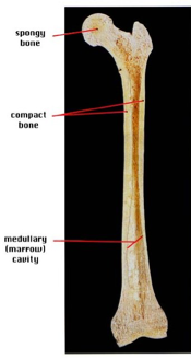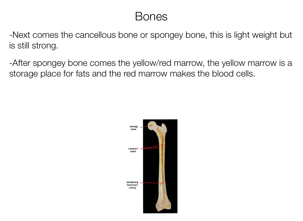 -After spongey bone comes the yellow/red marrow, the yellow marrow is a storage place for fats and the red marrow makes the blood cells.