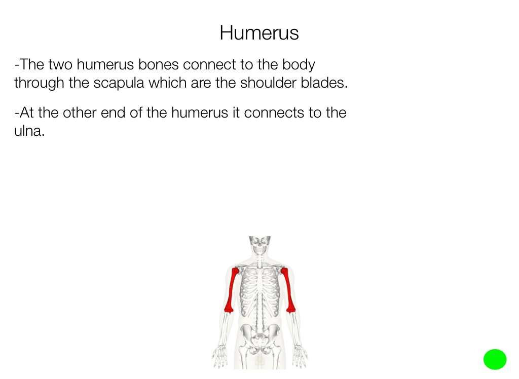 -The two humerus bones connect to the body through the scapula which are the shoulder blades.