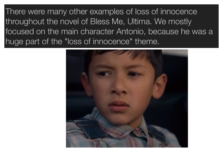 There were many other examples of loss of innocence throughout the novel of Bless Me, Ultima. We mostly focused on the main character Antonio, because he was a huge part of the "loss of innocence" theme.