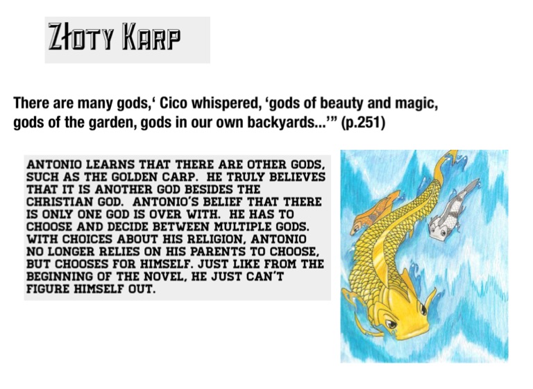 Antonio learns that there are other gods, such as the Golden Carp. He truly believes that it is another god besides the Christian God. Antonio's belief that there is only one God is over with. He has to choose and decide between multiple gods. With choices about his religion, Antonio no longer relies on his parents to choose, but chooses for himself. Just like from the beginning of the novel, he just can't figure himself out.