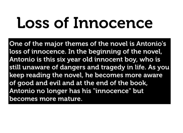One of the major themes of the novel is Antonio's loss of innocence. In the beginning of the novel, Antonio is this six year old innocent boy, who is still unaware of dangers and tragedy in life. As you keep reading the novel, he becomes more aware of good and evil and at the end of the book, Antonio no longer has his "innocence" but becomes more mature.