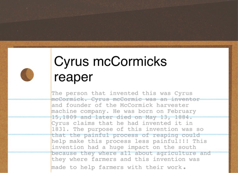The person that invented this was Cyrus mcCormick. Cyrus mcCormic was an inventor and founder of the McCormick harvester machine company. He was born on February 15,1809 and later died on May 13, 1884. Cyrus claims that he had invented it in 1831. The purpose of this invention was so that the painful process of reaping could help make this process less painful!!! This invention had a huge impact on the south because they where all about agriculture and they where farmers and this invention was made to help farmers with their work.