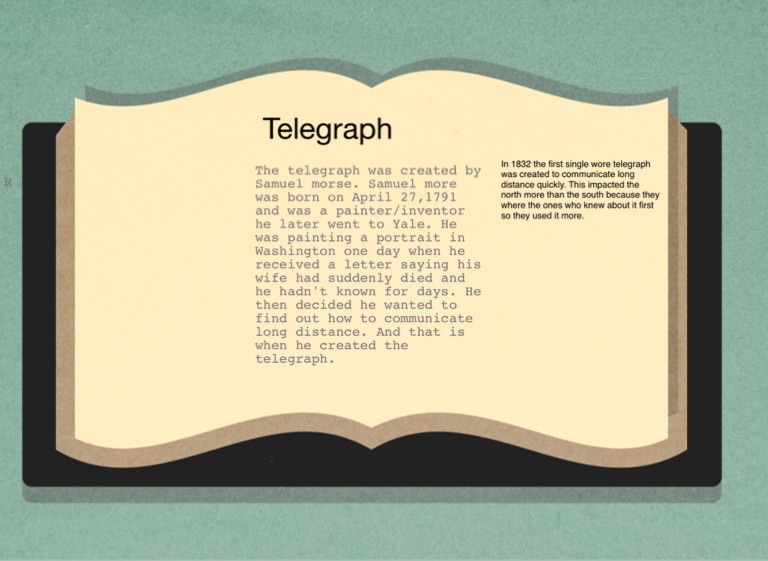 In 1832 the first single wore telegraph was created to communicate long distance quickly. This impacted the north more than the south because they where the ones who knew about it first so they used it more.