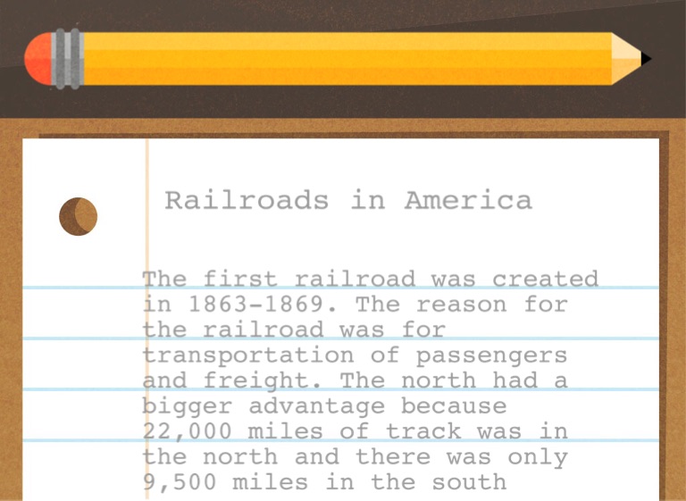 The first railroad was created in 1863-1869. The reason for the railroad was for transportation of passengers and freight. The north had a bigger advantage because 22,000 miles of track was in the north and there was only 9,500 miles in the south
