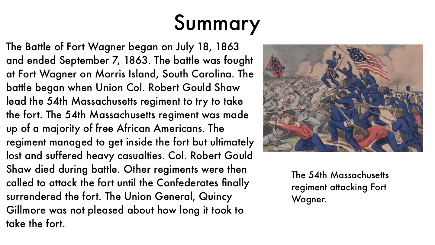 The Battle of Fort Wagner began on July 18, 1863 and ended September 7, 1863. The battle was fought at Fort Wagner on Morris Island, South Carolina. The battle began when Union Col. Robert Gould Shaw lead the 54th Massachusetts regiment to try to take the fort. The 54th Massachusetts regiment was made up of a majority of free African Americans. The regiment managed to get inside the fort but ultimately lost and suffered heavy casualties. Col. Robert Gould Shaw died during battle. Other regiments were then called to attack the fort until the Confederates finally surrendered the fort. The Union General, Quincy Gillmore was not pleased about how long it took to take the fort.