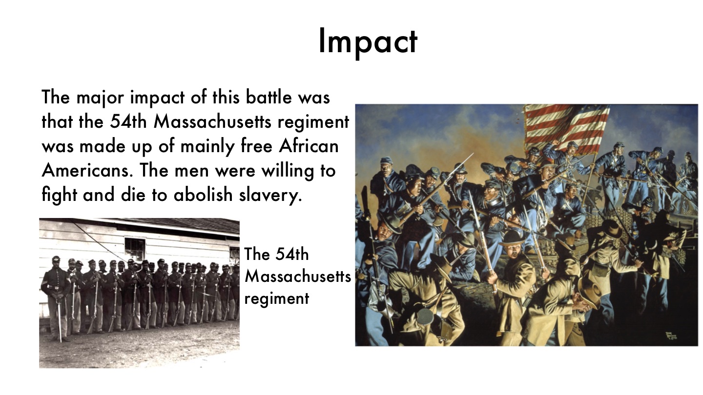 The major impact of this battle was that the 54th Massachusetts regiment was made up of mainly free African Americans. The men were willing to fight and die to abolish slavery.