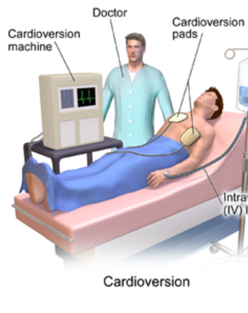 Cardioversion is the process when therapeutic doses of electric currents goes to the heart a specific moment in the cardiac cycle.