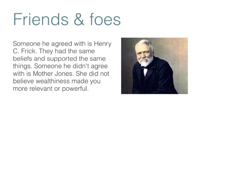 Someone he agreed with is Henry C. Frick. They had the same beliefs and supported the same things. Someone he didn't agree with is Mother Jones. She did not believe wealthiness made you more relevant or powerful.