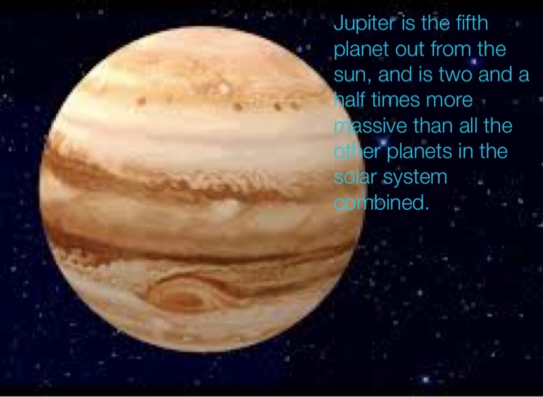 Jupiter is the fifth planet out from the sun, and is two and a half times more massive than all the other planets in the solar system combined.