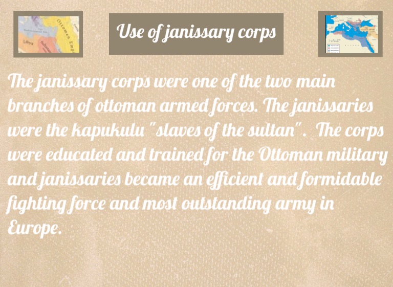 The janissary corps were one of the two main branches of ottoman armed forces. The janissaries were the kapukulu "slaves of the sultan". The corps were educated and trained for the Ottoman military and janissaries became an efficient and formidable fighting force and most outstanding army in Europe.