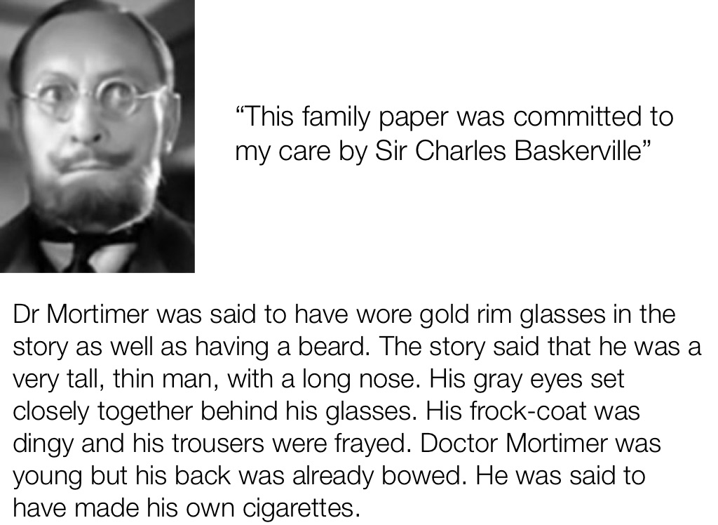 Dr Mortimer was said to have wore gold rim glasses in the story as well as having a beard. The story said that he was a very tall, thin man, with a long nose. His gray eyes set closely together behind his glasses. His frock-coat was dingy and his trousers were frayed. Doctor Mortimer was young but his back was already bowed. He was said to have made his own cigarettes.