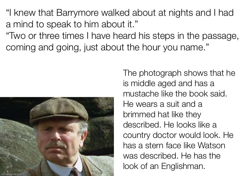 The photograph shows that he is middle aged and has a mustache like the book said. He wears a suit and a brimmed hat like they described. He looks like a country doctor would look. He has a stern face like Watson was described. He has the look of an Englishman.