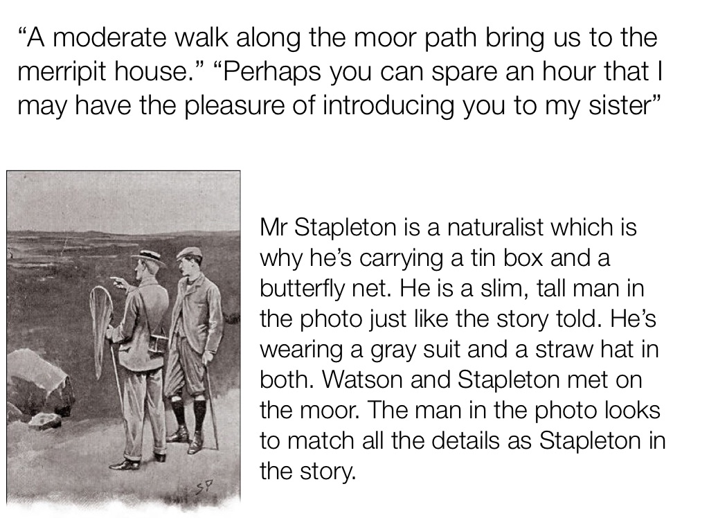 Mr Stapleton is a naturalist which is why he’s carrying a tin box and a butterfly net. He is a slim, tall man in the photo just like the story told. He’s wearing a gray suit and a straw hat in both. Watson and Stapleton met on the moor. The man in the photo looks to match all the details as Stapleton in the story.