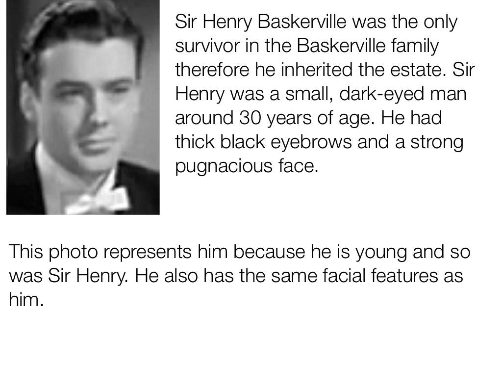 Sir Henry Baskerville was the only survivor in the Baskerville family therefore he inherited the estate. Sir Henry was a small, dark-eyed man around 30 years of age. He had thick black eyebrows and a strong pugnacious face.