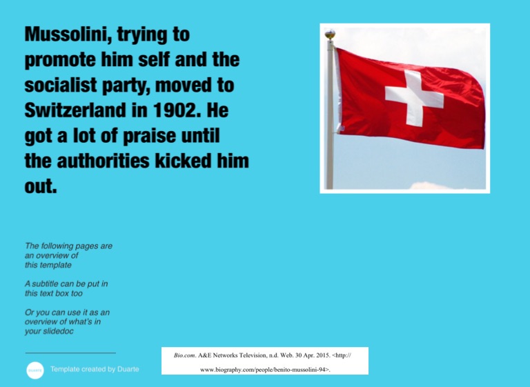 Mussolini, trying to promote him self and the socialist party, moved to Switzerland in 1902. He got a lot of praise until the authorities kicked him out.