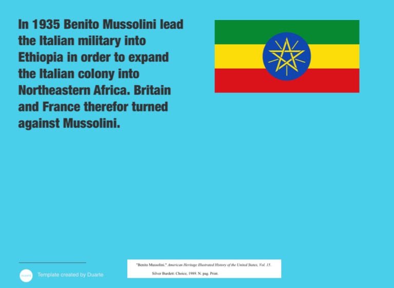 In 1935 Benito Mussolini lead the Italian military into Ethiopia in order to expand the Italian colony into Northeastern Africa. Britain and France therefor turned against Mussolini.