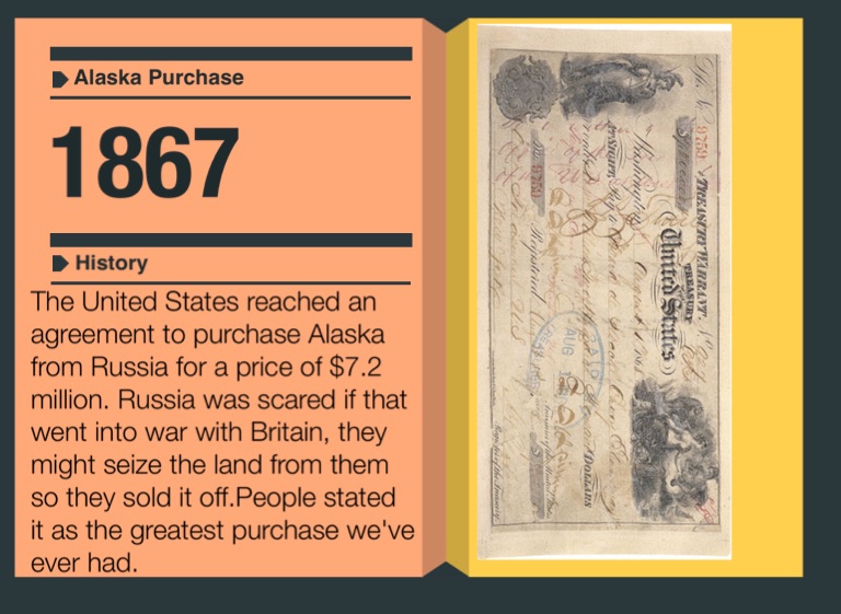 The United States reached an agreement to purchase Alaska from Russia for a price of $7.2 million. Russia was scared if that went into war with Britain, they might seize the land from them so they sold it off.People stated it as the greatest purchase we've ever had.