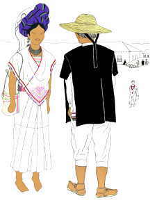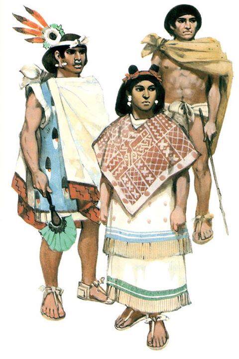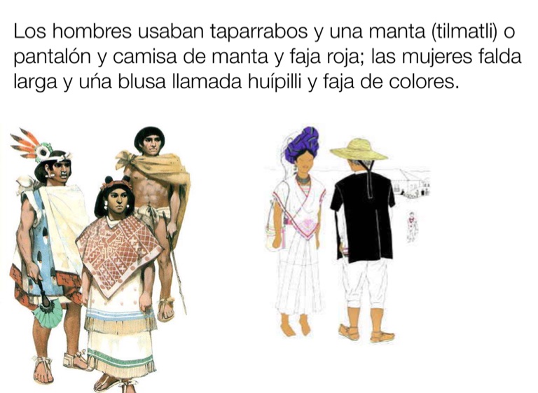 Los hombres usaban taparrabos y una manta (tilmatli) o pantalón y camisa de manta y faja roja; las mujeres falda larga y uńa blusa llamada huípilli y faja de colores.