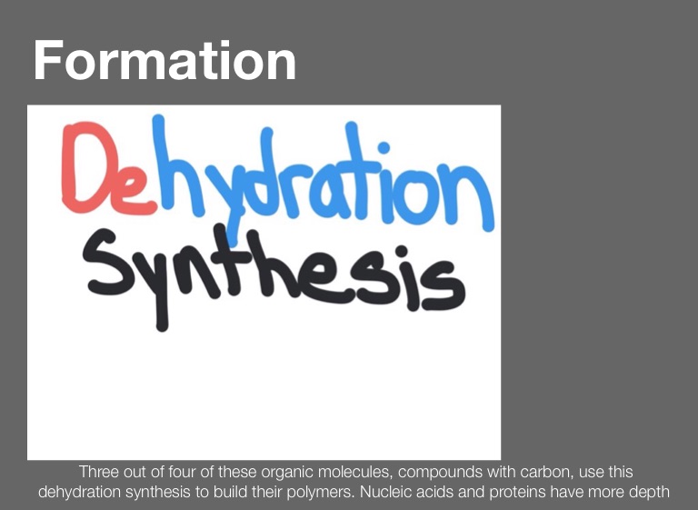 Three out of four of these organic molecules, compounds with carbon, use this dehydration synthesis to build their polymers. Nucleic acids and proteins have more depth to them.