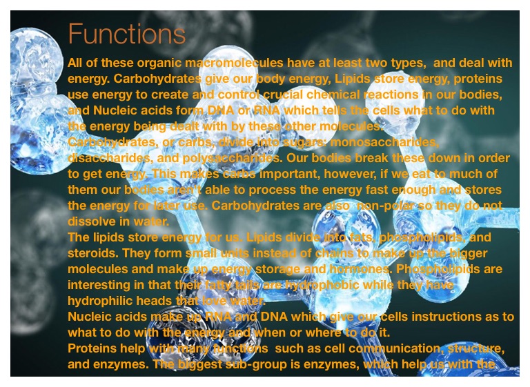 All of these organic macromolecules have at least two types, and deal with energy. Carbohydrates give our body energy, Lipids store energy, proteins use energy to create and control crucial chemical reactions in our bodies, and Nucleic acids form DNA or RNA which tells the cells what to do with the energy being dealt with by these other molecules.