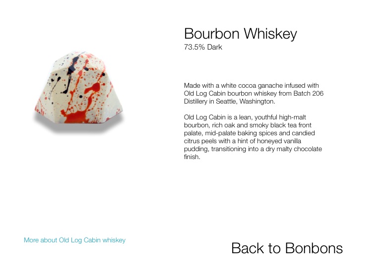 Made with a white cocoa ganache infused with Old Log Cabin bourbon whiskey from Batch 206 Distillery in Seattle, Washington.