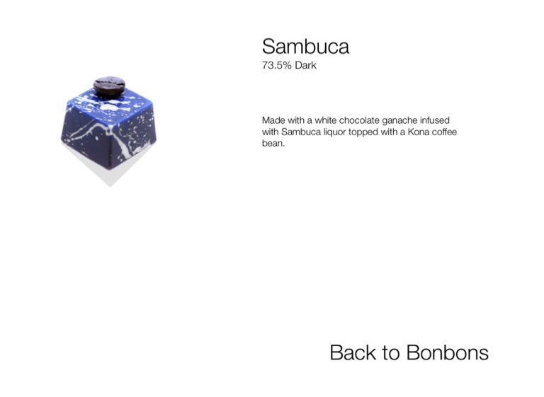 Made with a white chocolate ganache infused with Sambuca liquor topped with a Kona coffee bean.