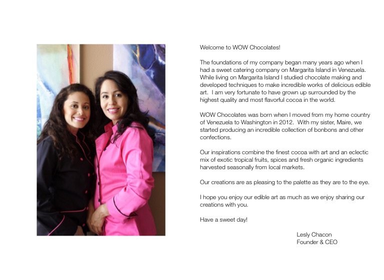 WOW Chocolates was born when I moved from my home country of Venezuela to Washington in 2012. With my sister, Maire, we started producing an incredible collection of bonbons and other confections.